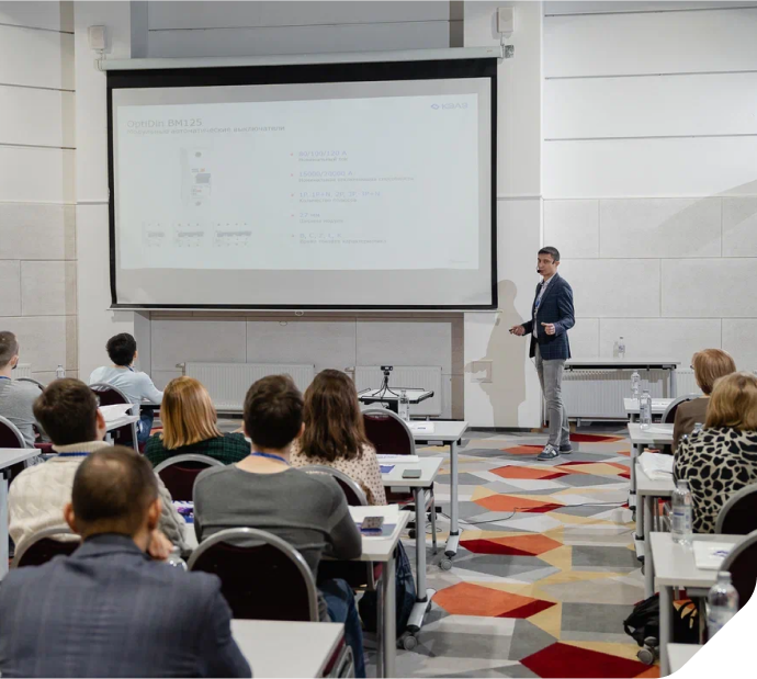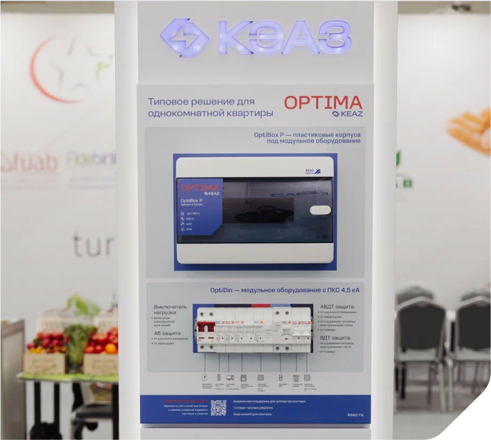 Другое исполнение мини-стенда для использования на витринах или мероприятиях. На стенде представления линейка модульного оборудования OptiDin с ПКС 4,5 кА.