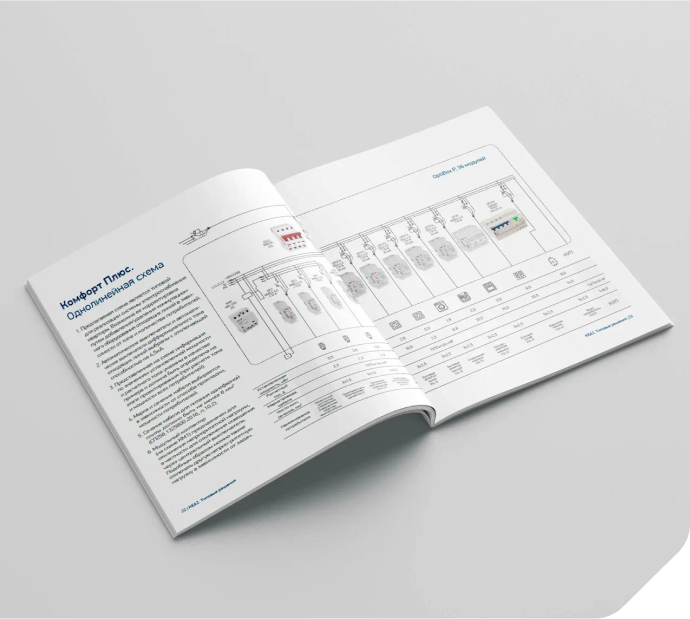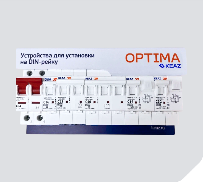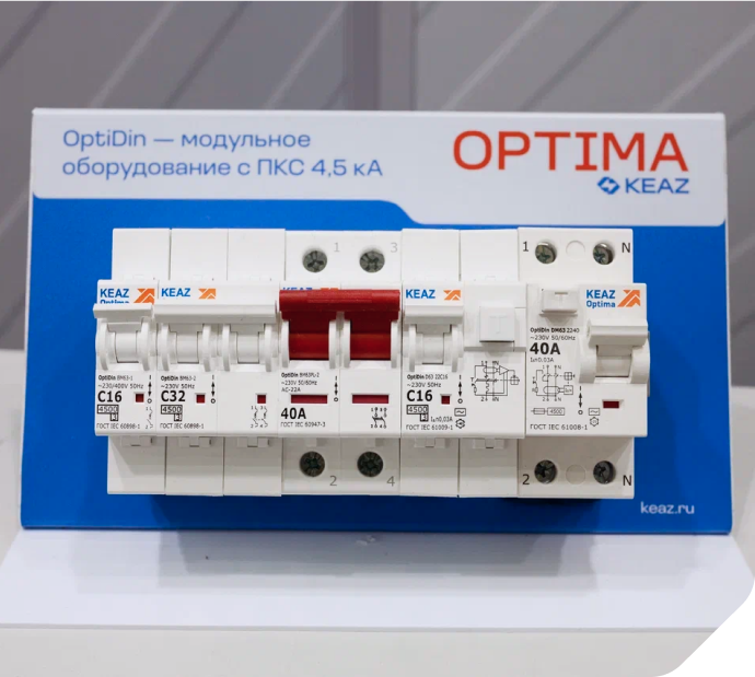 На стенде представлен универсальный вариант: модульные автоматические выключатели, выключатели нагрузки, ВДТ и АВДТ с отключающей способностью серии OptiDin с ПКС 4,5 кА.